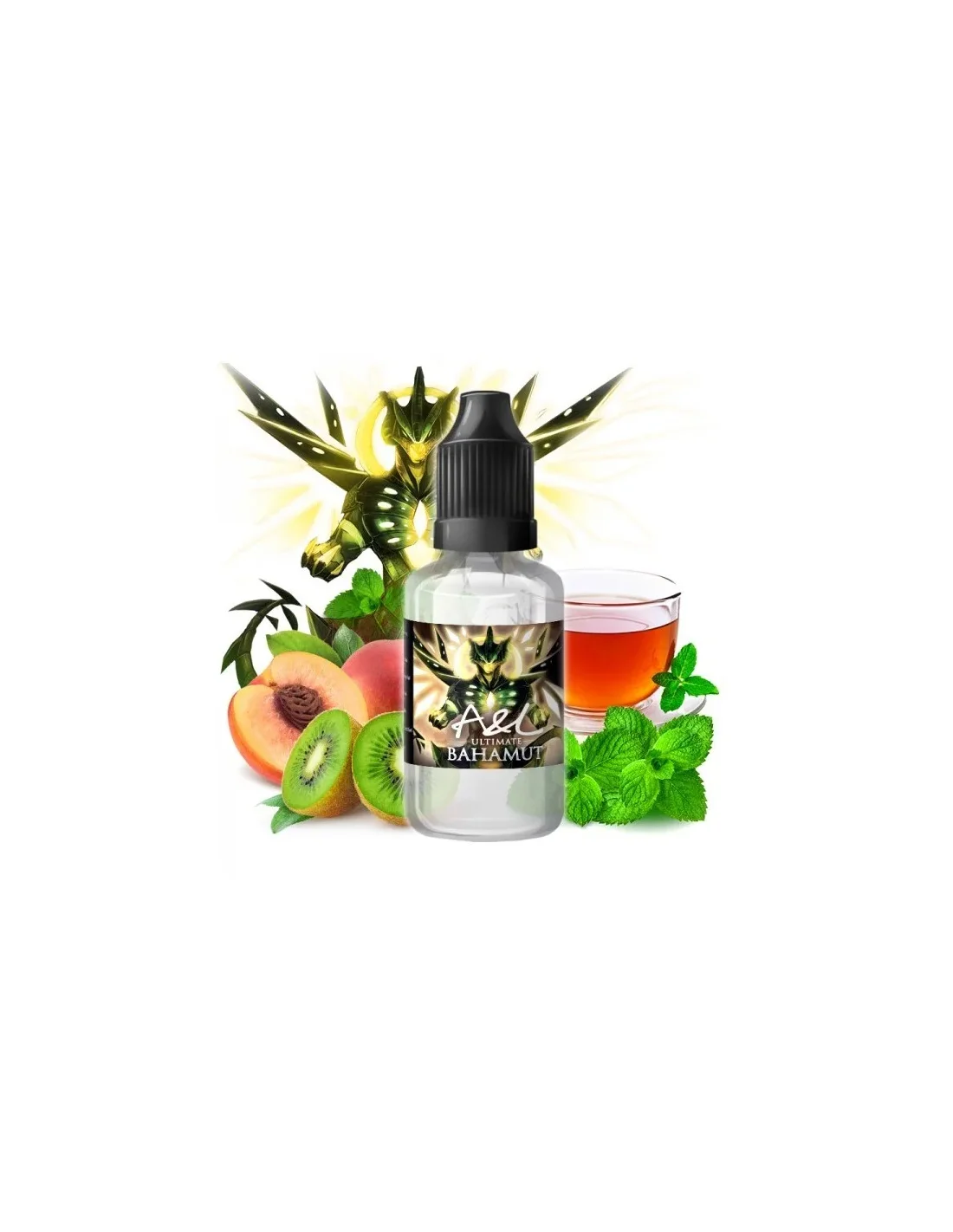 Découvrez le Bahamut de Arômes et Liquides, un concentré fascinant composé d'arômes de pêche et de kiwi, mélangés dans un thé à la menthe !
